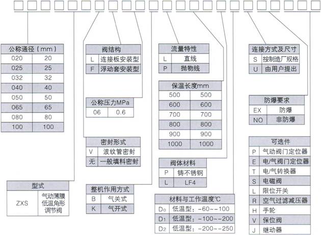 050ZXSVF06BQ700LD1SNOERH表示口径为50mm的气动薄膜低温角形波纹管密封调节阀,浮动套连接,公称压力0.6MPa,整机作用方式气关,等百分比流量特性。保温长度700mm,工作温度-100~-200℃,阀体材质LF4。连接方式及尺寸按制造厂标准,不要求防爆,配电/气阀门定位器、空气过滤减压器和操作手轮。